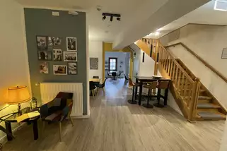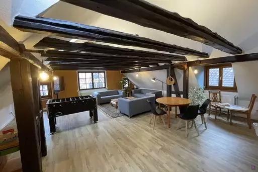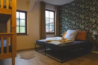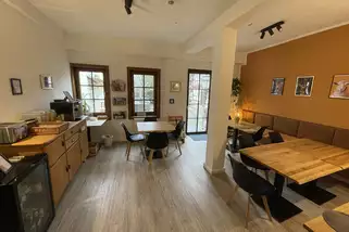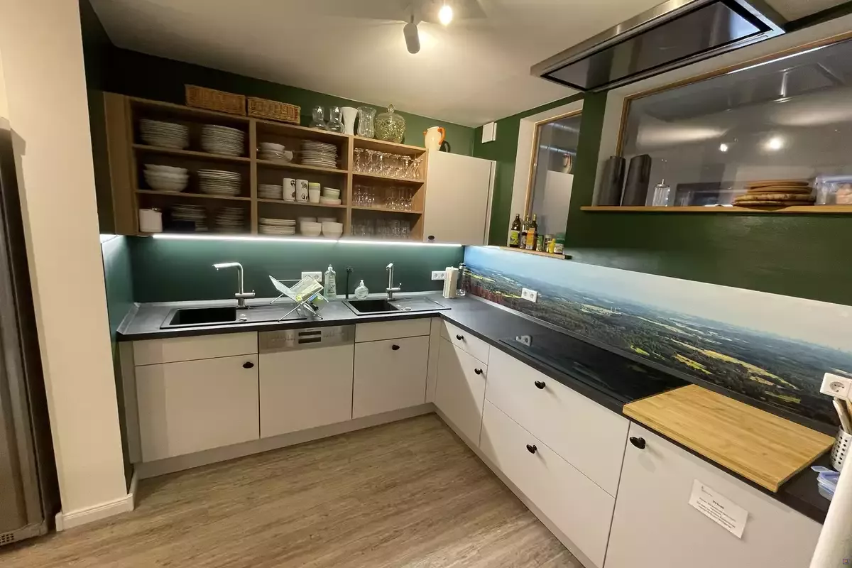 Neben den Zimmern bieten wir euch eine top ausgestattete Selbstversorgerküche sowie einen Speiseraum und ein Foyer mit Sitzgelegenheiten, die euch rund um die Uhr zur Verfügung stehen. Im Dachgeschoss haben wir eine großzügige Lounge. Hier findet ihr gemütliche Sofas, einen großen Tisch, Tischkicker, eine Spielecke für Kinder sowie unsere Snack-Bar. Bücher und Spiele für große und kleine Gäste stehen zur freien Nutzung bereit und laden zum gemütlichen Beisammensein ein.