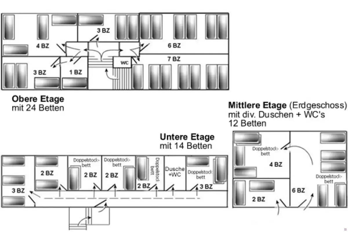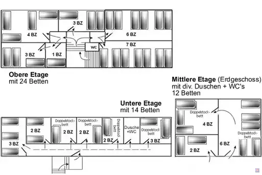 50 Betten in 15 Zimmern auf 3 Etagen, Großküche, Aufenthalts- und Essensraum + Grillhütte (gegen Aufpreis)