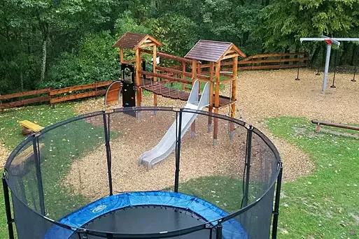 2 Kicker, Airhockey/Billiard, Ballspiele, Schaukeln und Wippe, Sandkasten, Volleyballnetz, Trampolin, Steilhang mit Strickleiter