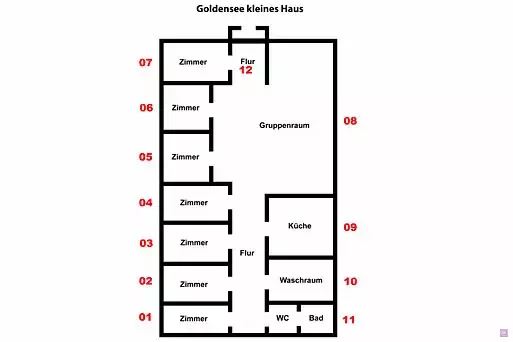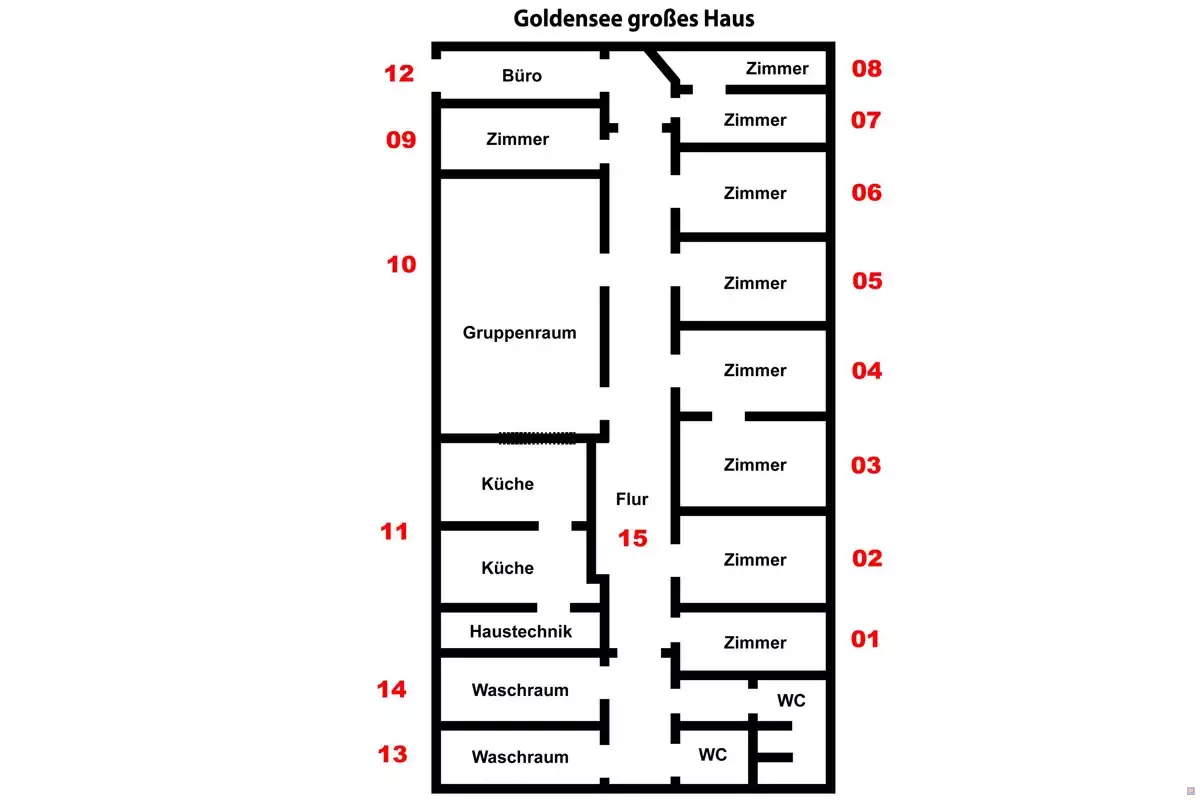 2x 3BZ, 5x 5BZ, 2 Waschräume, 2x2 Duschen, 2 WC`s und ein behindertengerechtes WC. Alle Zimmer sind geräumig. Es gibt eine große Küche und einen 55 qm Aufenthaltsraum.