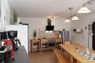 Ein Doppelzimmer (Bett 2x 1, 40 M.) , drei 3-Bett-Zimmer , ein 4-Bett-Zimmer. Großer Küchen/Aufenthaltsbereich mit extra großem Esstisch und zwei Küchenzeilen. Ein Appartement mit drei Betten, Küchenzeile und Duschbad.