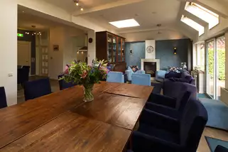Es gibt einen großen gemütlichen Gemeinschaftsraum von mehr als 100 m2 mit Kamin. Hier können Sie auch zusammen mit einer Gruppe von 20 Personen lecker essen. Die Kombination aus einem langen Tisch und 6 kleinen Tischen ermöglicht es Ihnen, verschiedene gemütliche Sitzgelegenheiten im Handumdrehen in einen langen Esstisch zu verwandeln, oder welche Anordnung Sie auch immer wünschen.