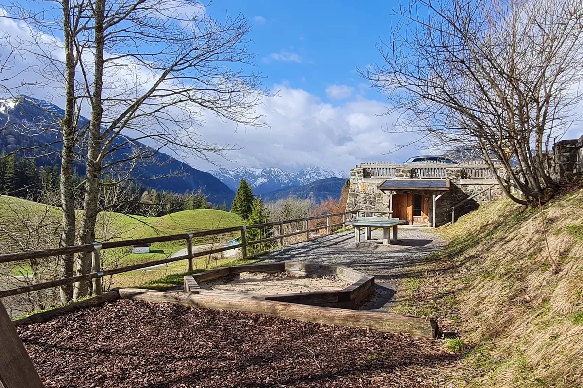 Große Außenterrasse und Gelände mit Spielplatz, Bogenschießen (auf Anfrage), Bergwandern, Mountainbiken, Rodelbahn, Alpinsport (Ski- und Wanderparadies Sudelfeld).
