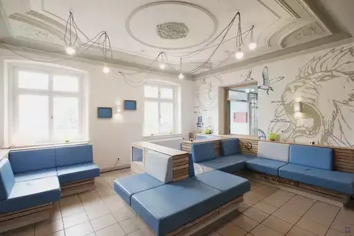 Großer Speisesaal, 5 Seminarräume, helle offene Lounge mit verschiedenen Sitzelementen, Dachstudio mit Klavier als Probenraum für Orchester- und Theatergruppen, Forum für Theaterspiele, Mehrzweckraum mit Billard, Kicker und Tischtennis, mehrere Aufenthaltsräume, hauseigenes Bistro.