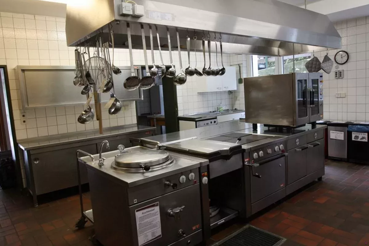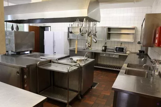 Die großzügige Gastronomieküche ist voll ausgestattet und auf hohe Kapazitäten ausgerichtet: ein leistungsstarker 6 Platten Gastronomie-Elektroherd, ein Konvektomat, eine Spültisch 2 Geschirrspülern, 2 Kühlschränke, sowie Edelstahl-Arbeitsflächen ermöglichen reibungslose Abläufe auch bei großen Gruppen. Töpfe, Pfannen, Geschirr und Besteck sind in ausreichender Menge vorhanden. Für Frühstück oder Snacks stehen Kaffeemaschinen, Wasserkocher und Toaster bereit.