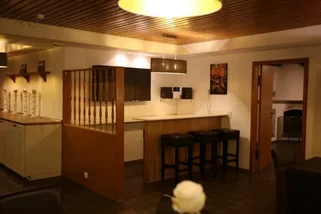 Ein Herzstück ist die große Selbstversorger-Küche mit Gastro-Herd, Spülmaschine, Konvektomat und Kühltechnik – ideal für Kochteams. Angrenzend: ein einladender Speiseraum mit Theke und Musikanlage sowie ein gemütliches Kaminzimmer für gesellige Abende mit offenem Kamin und Fernseher.