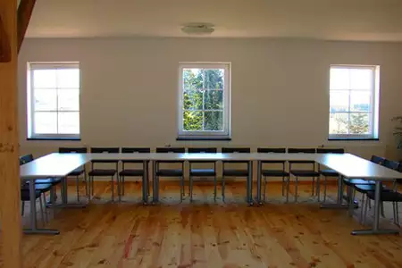 Der Seminarraum von 85 qm im ersten Stock kann zusaetzlich gemietet werden. Der Raum hat einen schoenen Holzboden und ist auch gut geeignet fuer Meditation, Yoga, Tanzkurse, Chorproben u.s.w.
