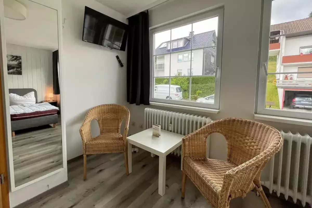 Im Inneren des Hauses erwartet Sie ein gemütlicher Wohnbereich mit bequemen Sitzmöglichkeiten und einem breiten Angebot an Spielen – perfekt für entspannte Abende nach einem aktiven Tag in der Natur. Der angrenzende Wintergarten bietet einen traumhaften Ausblick ins Wiedatal und lädt zum Lesen, Plaudern oder einfach zum Genießen ein – unabhängig vom Wetter.