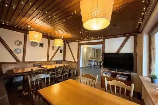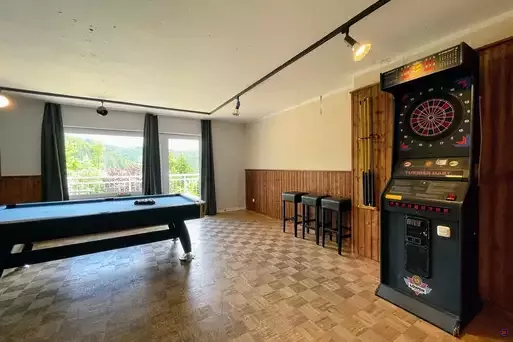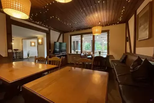 Auf mehreren hundert Quadratmetern Wohnfläche bietet das Ferienhaus Platz für Gruppen von bis zu 30 Personen. Es verfügt über mehrere Schlafzimmer, einen gemütlichen Wohnbereich, eine voll ausgestattete Küche, moderne Badezimmer und liebevoll gestaltete Aufenthaltsräume. Für Entspannung sorgen eine hauseigene Sauna sowie eine große Terrasse mit Grillmöglichkeiten und Gartenmöbeln. Ein Spielzimmer für Kinder und ein Gemeinschaftsraum mit Billard, Kicker und Dart machen das Haus ideal für Familien, Freunde oder ganze Gruppen.