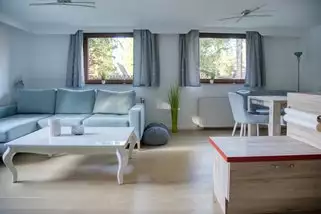 Das Ferienhaus liegt im Ferienpark am Waldsee. Das Haus befindet sich am Waldrand und hat 3 separate Wohnungen mit insgesamt 175 qm. Die oberste Wohnung hat 35 qm und eine wunderschöne Dachterrasse, die mittlere Wohnung hat 3 Schlafzimmer und 75 qm und die Souterrain Wohnung verfügt über 65 qm und 2 Schlafzimmer.