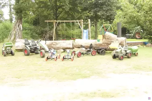 Auf unserem Hof gibt es einen Spielplatz und viele Fahrzeuge (Kettcars, Traktoren usw.) für Kinder.