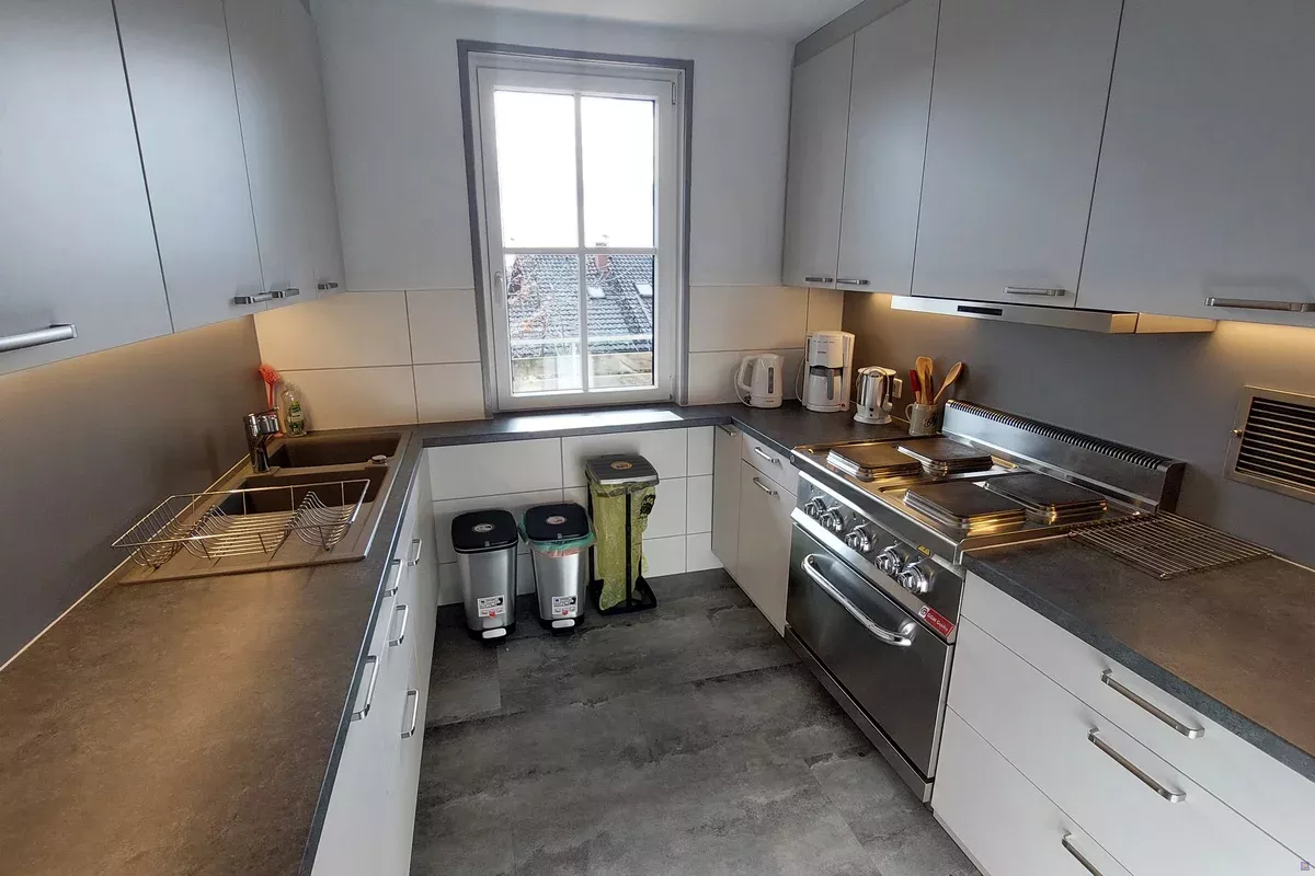 Die Selbstversorgerküche ist komplett ausgestattet mit Geschirr für 25 Personen. Es gibt zusätzlich zum Kühlschrank noch eine große Kühl-Gefrierkombination .
