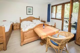 Alle Zimmer sind gemütlich im Landhausstil eingerichtet und verfügen über eigene DU/WC sowie Balkon oder Terrasse. Die Zimmer liegen sehr ruhig (einzig das Rauschen des Gebirgsflusses Trettach ist zu hören) und bieten einen schönen Blick auf die Oberstdorfer Bergwelt.