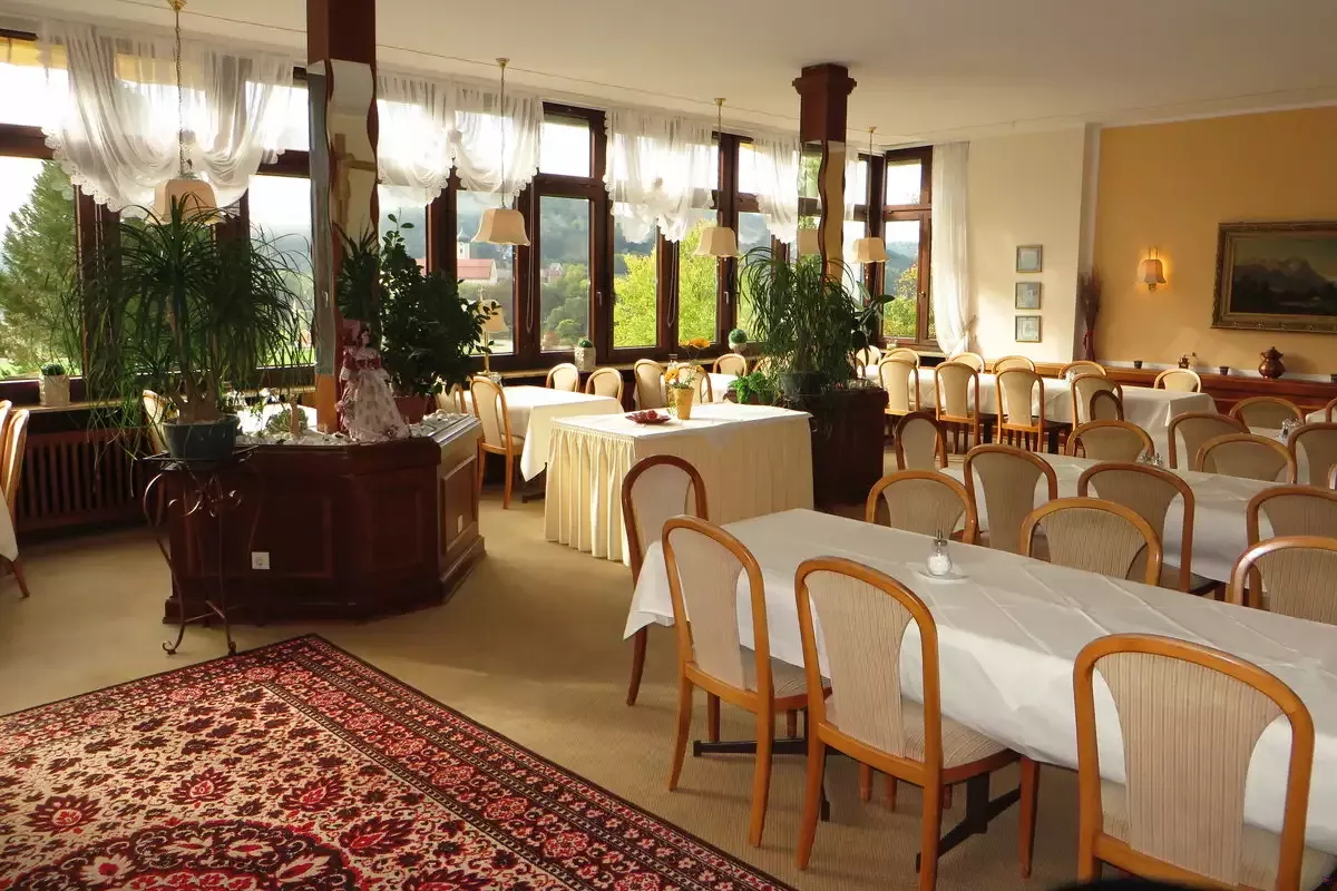 Der Speisesaal mit herrlichem Blick über das Tal und auf das Benediktinerkloster bietet Platz für bis zu 60 Personen. Für unsere Hotelgäste bieten wir auch Halb- oder Vollpension an.