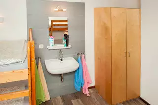 Das behindertengerechte Bad im Erdgeschoss ist barrierefrei zu erreichen. Fast alle Zimmer verfügen über ein eigenes Waschbecken.