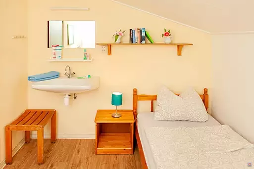 9 weitere Schlafzimmer (sechs 2-Bettzimmer, zwei 3-Bettzimmer, ein 1-Bettzimmer) sowie vier Toiletten und zwei Duschen verteilen sich auf das Obergeschoss.