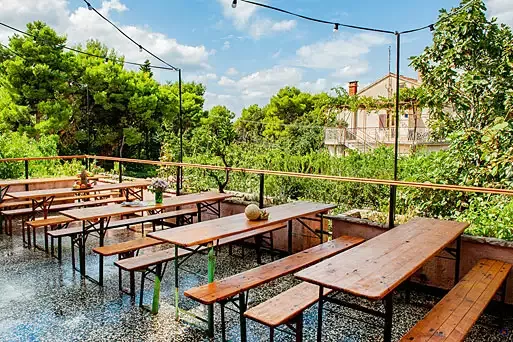 Die Villa Lemon ist ein typisches kroatisches Haus, das aus mehreren Etagen besteht. Im Suterre befinden sich zwei Apartments mit eigenem Bad. Im Erdgeschoss befindet sich der Aufenthaltsraum, die Küche und weitere drei Schlafzimmer. Außerdem finden die Mahlzeiten auf der Terrasse statt, die an den Aufenthaltsraum anschließt. Im Obergeschoss befinden sich weitere 5 Schlafzimmer die teilweise mit einem Balkon ausgestattet sind. Zu dem Haus gehört ein kleiner Garten mit Tischtennisplatte und Sitzgelegenheiten.
