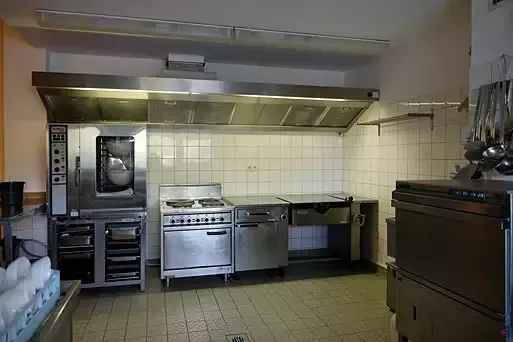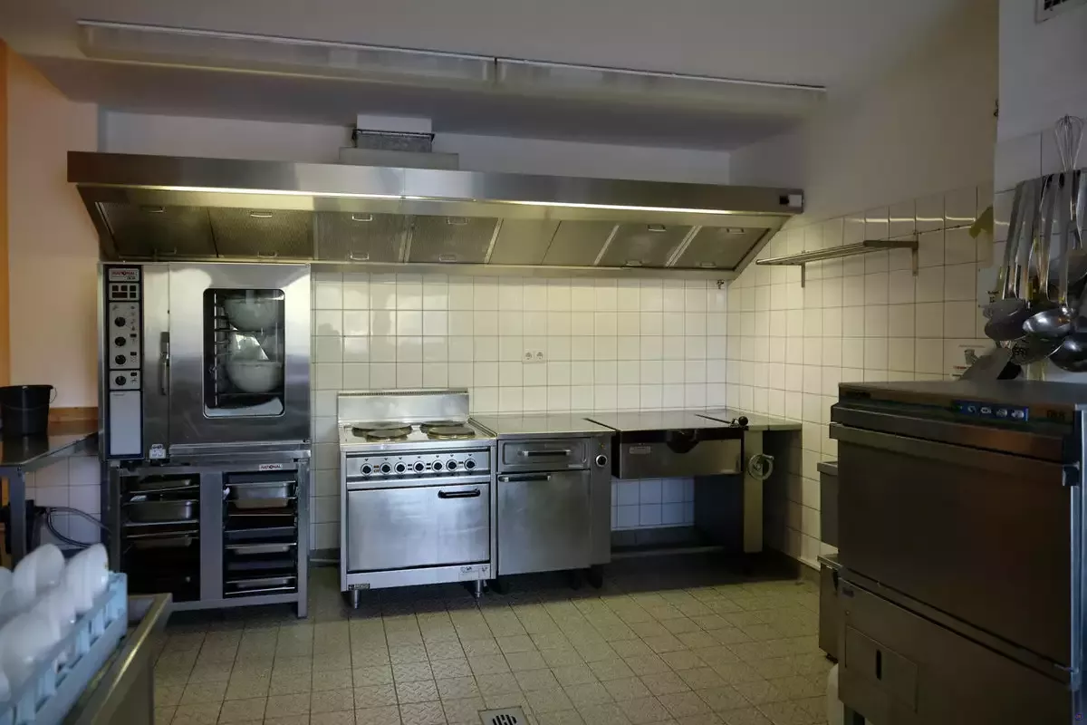 Sehr gut ausgestattete Gruppenküche mit u.a. Elektroheißluftherd, Backofen, Friteuse, Kippbratpfanne und -kessel, Industrie-Spülmaschine mit Sitzecke und angrenzendem Lagerraum mit Kühlschrank.