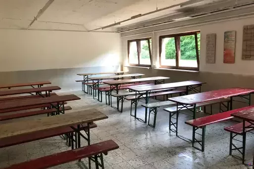 Platz für 500 Personen, fließend Wasser, Strom, Sanitäranlagen, Kochstelle, Dusche, Aufenthaltsraum