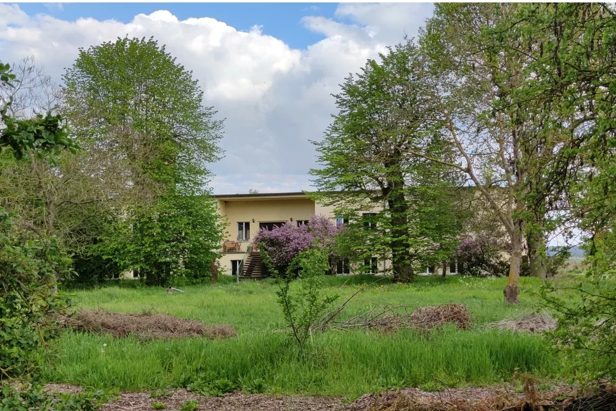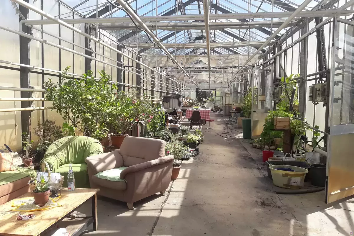 Das Gemeinschaftshaus liegt 50 Meter vom Wohngebäude entfernt, so dass es dort auch mal laut werden darf. Es gibt den großen Gemeinschaftsraum mit rund 196 m² und einen Workshop- oder Seminarraum mit 70 m². Im Wohnhaus gibt es einen Arbeitsraum mit 40 m².