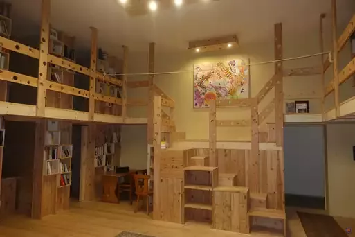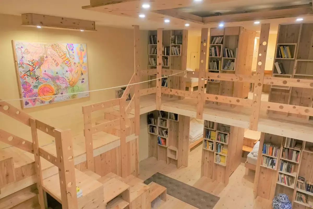 Die "Hostelzimmer" sind mit naturbelassenem Holz verkleidet. Der große Hostelraum mit 12 Betten bietet zwölf kleine Kabinen mit Bett, Tisch und Schrank.