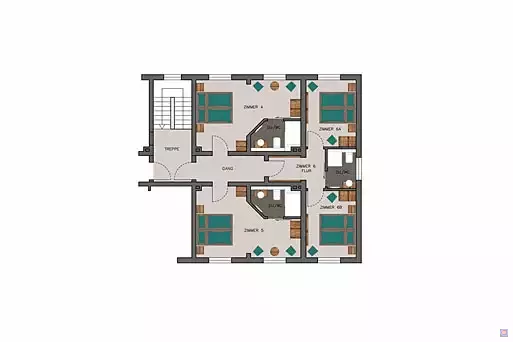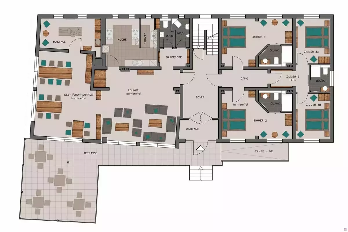 Die Unterkunft ist teilweise behindertengerecht: Erdgeschoss mit Gruppenraum/Essraum, Küche, Lounge, Flur und ein Doppelzimmer sind barrierefrei.