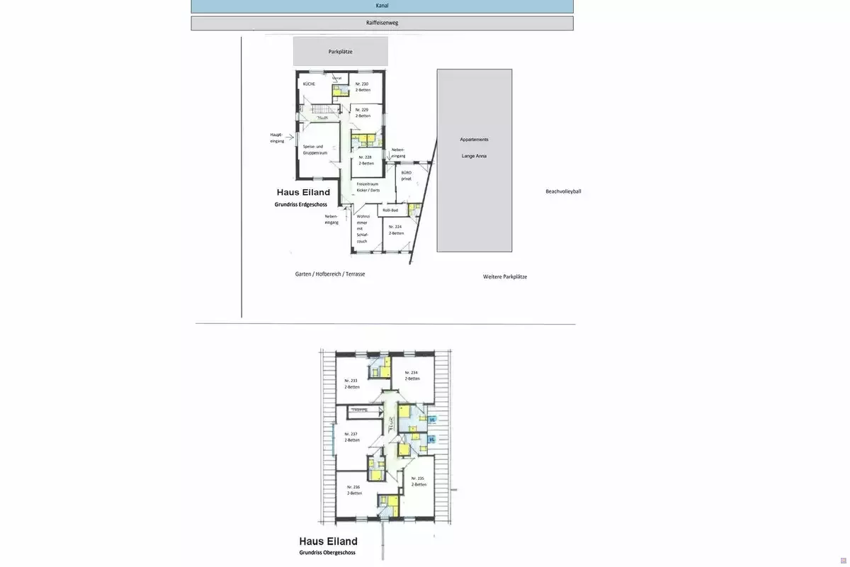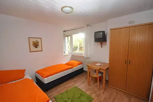 Kleines Gruppenhaus mit 9 Doppelzimmern (natürlich auch als EZ zu nutzen), alle Zimmer mit DU/WC und SAT/TV (32" Flachbild-TV). Ideal für Personen, die eine Unterbringung in Einzel- oder Doppelzimmern mit eigenem Bad/DU/WC bevorzugen.