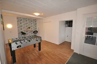 Darüber hinaus gibt es eine gutausgestattete Küche, einen Gruppen- / Speiseraum mit großem 50 Zoll-TV, ein Teamerzimmer (Wohnzimmer), einen Freizeitraum mit Kicker und E-Dart sowie eine Terrasse und Garten mit Sitzgelegenheiten, Beachvolleyballfeld, Grillstelle und ausreichend Parkplätze.
