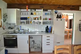 Wohnzimmer mit alten Balken, neuer Einrichtung, Fernseher und Telefon (auf Wunsch kann der Fernseher entfernt werden). Küche mit alten Balken und Stallfenstern, mit Sitzgruppe, Einbauküche und Geschirrspüler. Separates Duschbad mit WC und Waschmaschine. 60 qm Diele als Speise-, Aufenthalts- und Vortragsraum, mit einer Sitzgruppe (bis 20 Personen), einem großen Kühlschrank, einem Kaminofen und einer breiten Dielentür zur Terrasse.