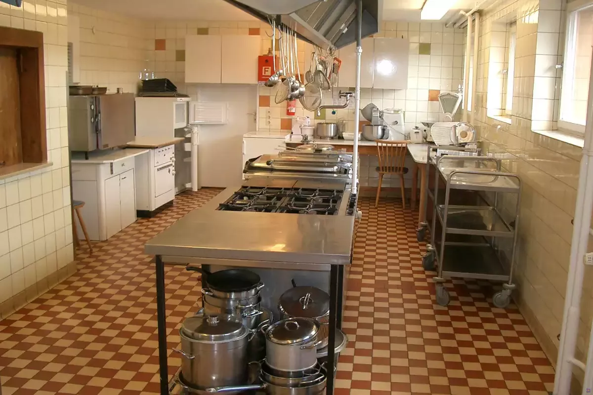Nur für Sebstversorger! Die Küche ist groß und hell. Küchen-Ausrüstung: Gasherd mit 6 Flammen, Back-u. Wärmeofen, Gasherd mit 6 Flammen, Gas-Hockerkocher, Heißluftbackofen= 6 Bleche 33x53cm, Elektro-Kippbratpfanne 60x60 cm, Fritteuse 2x je 20x40x23cm, 1 Kühlschrank 70x60x140, 3 Haushalts-Kühlschränke, Gefriertruhe 40x60x110 cm, Küchenwaage, Handrührgerät, Pürierstab, Wasserkocher, Haushaltskaffeemaschinen (mit Filtertüten 4). Verpflegung - auch einzelne Mahlzeiten - durch mehrere örtliche Gastronomiebetriebe möglich.