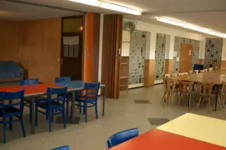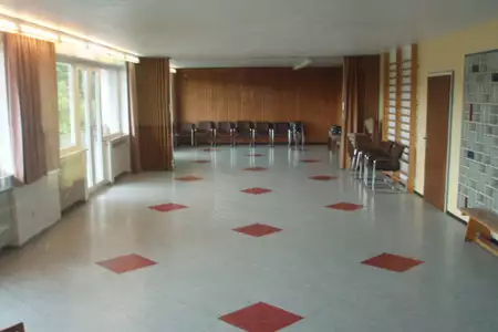 Große, helle Aufenthaltsräume, Schallschutzfenster mit freiem Blick auf den Feldberg. Flexible Raumnutzung macht das vom Stil der 50-er Jahre geprägte Haus für unterschiedliche Gruppen interessant. Ein großer Speiseraum (Bestuhlung, 120qm) ist mittels Trennwänden in 3 Räume zu unterteilen. Ebenso bietet der teilbare Gymnastikraum (100qm) für Musikproben, Körperarbeit und Meditation gute Voraussetzung. 2 kleinere angrenzende Räume (25 und 16qm) sind variabel zu nutzen.