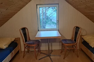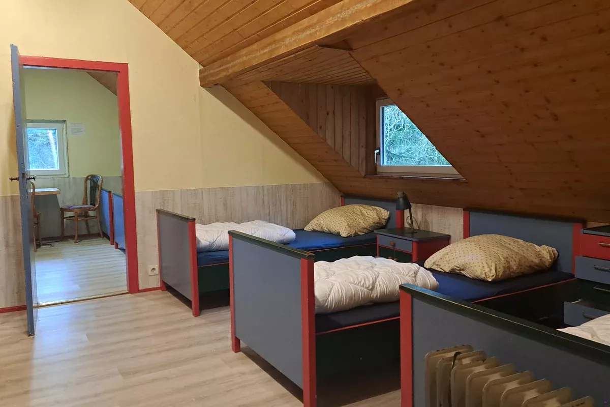 Das Haus am Mühlberg bietet Platz für bis zu 16 Personen in vier Zimmern. Im Obergeschoss befindet sich ein Vierbettzimmer. Dieses Zimmer ist Durchgangszimmer zu einem Fünfbettzimmer und einem Zweibettzimmer. Sie schlafen in Einzelbetten. Im Erdgeschoss befindet sich das vierte Zimmer – ein Fünfbettzimmer mit zwei Doppelstockbetten und einem Einzelbett. Ebenfalls im Erdgeschoss befinden sich die beiden Aufenthaltsräume.