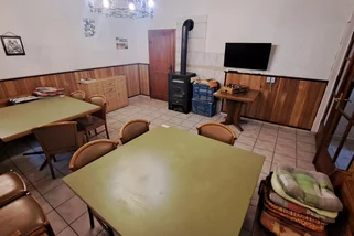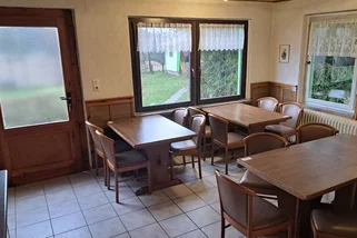 Hier ist Platz für bis zu 14 Personen bzw. 16 Personen. Der größere Raum hat einen Kaminofen, für gemütliche Stunden am Abend. Die Küche ist komplett ausgestattet mit Geschirrspüler, zwei Backröhren, zwei Cerankochfelder, zwei Kühlschränke jeweils mit einem Gefrierfach und einem Gefrierschrank.