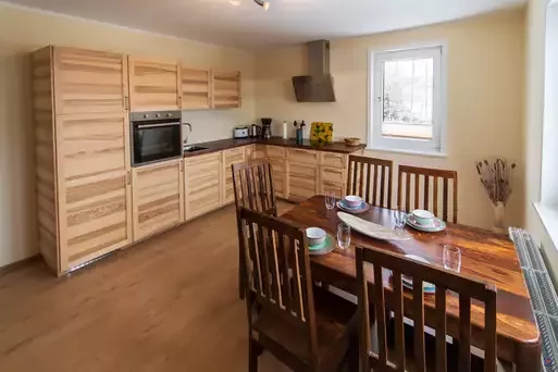 Die angrenzende, voll ausgestattete Küche ist ein weiteres Highlight des Hauses. Sie bietet ausreichend Platz und moderne Geräte, um gemeinsam zu kochen und zu speisen. Im Gruppenraum neben der Küche können alle Gäste gemütlich zusammenzusitzen und Mahlzeiten genießen. Auch für größere Gruppen ist hier ausreichend Geschirr, Besteck, Töpfe und Pfannen vorhanden.