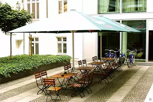 Draußen bieten wir Euch einen großen Innenhof mit Tischen und Sonnenschirmen zum Entspannen und zum Leute kennenlernen.