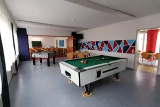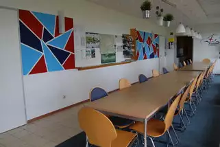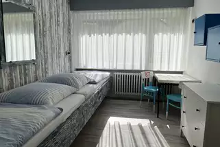 Schöne, helle 11qm große Doppel und Einzelzimmer. Sowie zwei neue 5 Bettzimmer mit je 22 qm. Alle Zimmer sind ausgestattet mit Bett, Tisch, Stühle, Schrank oder Kommode, Waschbecken und Heizkörper. Ein Klassenzimmer 50 qm mit Tafel, Tageslichtprojektor, Beamer, Schulbänke und Stühle. Aufenthaltsraum 50 qm mit Bücherei, Bluetooth Box, Getränkeautomat, Billard(gegen Gebühr) und Tischkicker.
