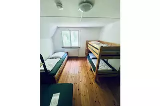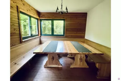 Unsere Hütte am See hat im Erdgeschoss eine sehr gut ausgestattete Küche, zwei Duschen mit Toiletten, einen Aufenthaltsraum mit Kachelofen und daran angrenzend ein Esszimmer bis ca. 15 Personen!