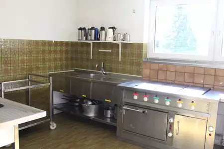 Haus 1: Großküchenherd und– Backofen, großer Kühlschrank (bei Bedarf zweiter Kühlschrank vorhanden), Wasserkocher (keine Kaffeemaschine) – Küche für Gesamtkomplex (Mietung Haus 1 + 2)