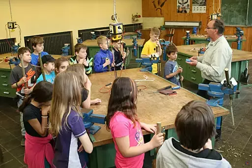 Neben Gruppenräumen mit Medienausstattung und einer Holzwerkstatt mit 30 Arbeitsplätzen ist ein geräumiger Speisesaal vorhanden.