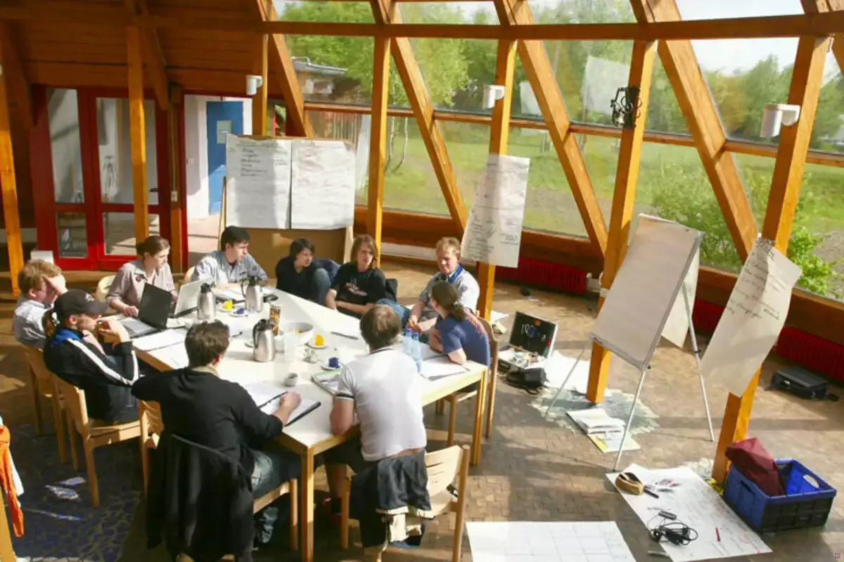 Herzstück des Jugendzeltplatzes ist das 350 qm große Funktionsgebäude, der sogenannte Rundling. In ihm befinden sich eine Küche, Sanitärbereich, Platzwartbüro, barrierefreie Schlafräume und der Versammlungsbereich mit gemütlichem Kaminofen.