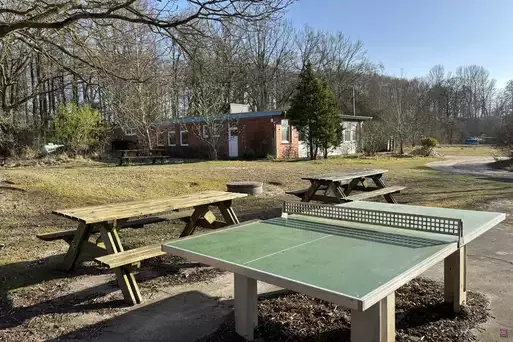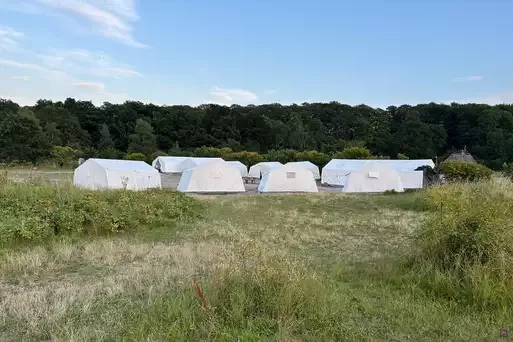 Zeltplatzfläche für 150 Personen in mitgebrachten Zelten. Sanitäre Ausstattung: 6 Duschen und Waschbecken für Mädchen und Jungen, 1 Dusche und WC für Gruppenleiter, 1 barrierefreies WC, 1 separates WC-Haus mit Betreuertoilette und Betreuerdusche.