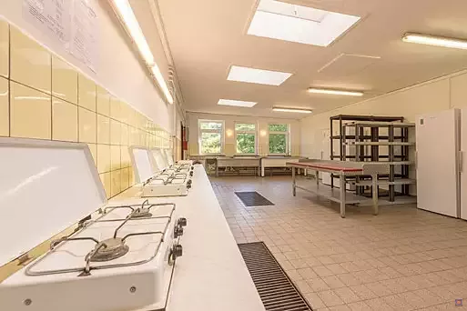Küchenausstattung: 6 Kleinkochstellen, mehrere Hockerkocher, 4 Kühl- und Tiefkühlschränke, Lagerregale, Großküchenspülen, 1 Waschmaschine.
