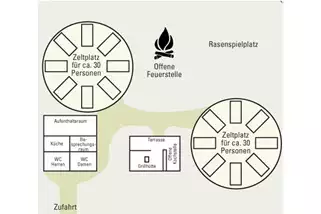 Platz für 60 Personen, fließend Wasser, Strom, Sanitäranlagen, Kochstelle, Dusche, Aufenthaltsraum