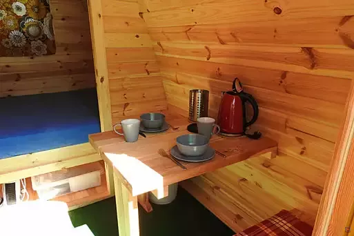 Neu stehen 3 Pods, 3 Glamping Pods mit Bad (kleine Holzhäuschen), für je 3 - 4 Personen zur Verfügung und 3 Mietwohnwagen für je 4 - 5 Personen. Alle Mietobjekte sind voll eingerichtet.