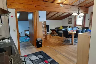 Die Wohnung bietet Platz für bis zu 10 Personen. Der Wohnraum ist ausgestattet mit einer Sofalandschaft, Smart-TV, Bluetooth-Soundbar, großem Esstisch und wird mit seiner offenen, handgefertigten Schreinerküche zum Mittelpunkt Ihres Aufenthalts.