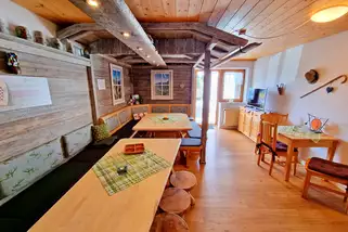 Unser Aufenthaltsraum im Tiroler Landhausstil lädt zu geselligen Abenden ein.