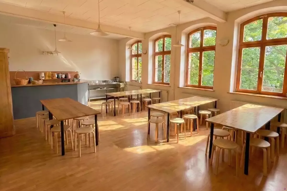 Das Herzstück für größere Gruppen, Seminare und Klassenfahrten. Der helle, 55 m² große Saal mit integrierter Küche ist ideal für Workshops, gemeinsames Kochen oder als Probensaal für Chöre. Dank Glasfaser-WLAN und moderner Tagungstechnik (Beamer, Flipchart) lässt es sich hier konzentriert arbeiten.