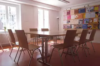 Im großen Raum auf der Gartenseite des Souterrains können bis zu 35 Personen an Tischen, bis zu 55 Personen in Stuhlreihen bequem Platz finden. Zwei weitere Räume auf dieser Ebene bieten Platz für Gruppen bis zu 16 (Seminarraum 2) bzw. 12 Personen (Seminarraum 3). Im Hochparterre können an einem großen Tisch im Seminarraum 4 (zur Gartenseite gelegen) ca. 8 Personen Platz nehmen. Die Räume sind sowohl einzeln als auch in Kombinationen buchbar.