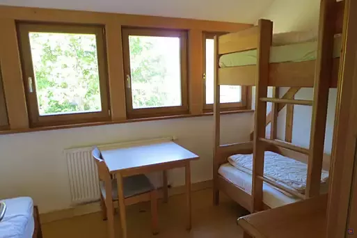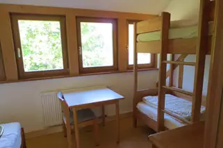 Unsere Zimmer sind hell und freundlich, mit Linoleumboden und Massiv-Holzbetten umweltbewusst eingerichtet. Im Erdgeschoss des Übernachtungshauses befindet sich der Aufenthaltsraum für ca 40 Personen, Toiletten und die Selbstversorgerküche sowie ein Zugang zu der Hausterasse auf der einen Seite mit kleinen Festzelt für ca 60 Pers. sowie auf der anderen Seite zum Biergarten unserer Gastwirtschaft.