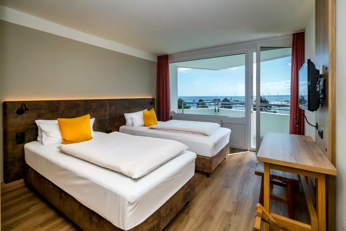 Komfortzimmer: Hotelzimmer für 1 bis 2 Personen (ca 31 qm) im Ostseehotel, mit Doppelbett, Duschbad, Telefon, Flachbild-Fernseher, Fön im Bad, Balkon, auch zur Einzelbelegung buchbar, wahlweise mit Meerblick, zwei Hunde pro Objekt auf Anfrage.